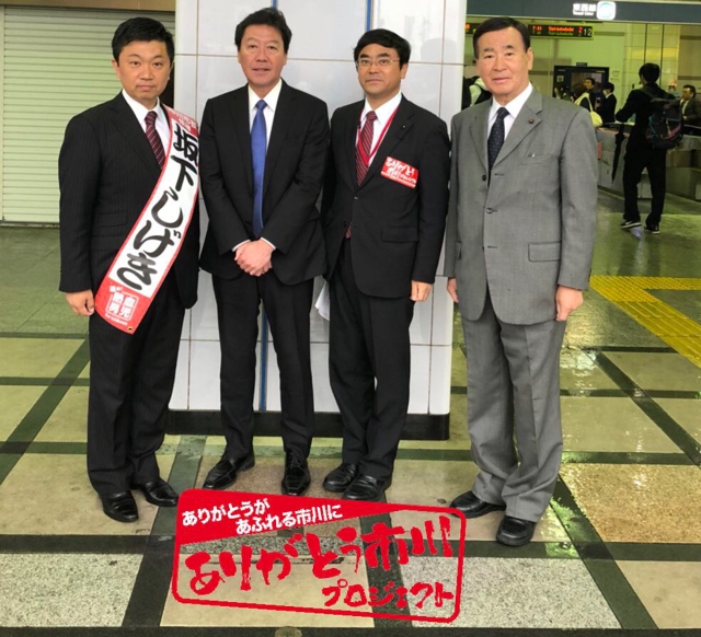 妙典駅は赤間正明県議、服部友則八千代市長、松井努議長、坂下しげき市長候補