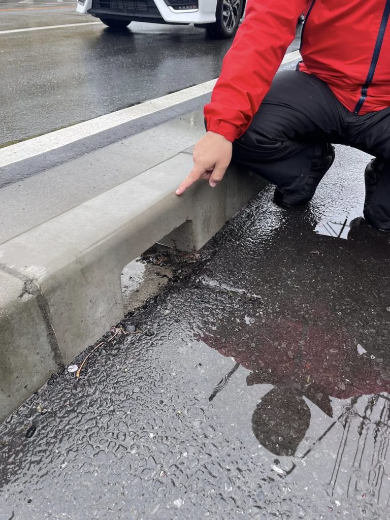 小雨の状況で、市川松戸線の歩道の状況を確認したく、急ぎ、現場へ