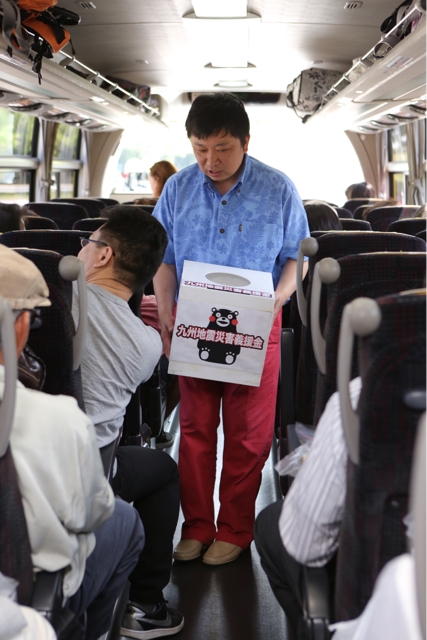 車中で、熊本地震の応援募金にご協力をお願いし旅行会参加者の皆様方とスタッフで150,000円の協力を頂きました。